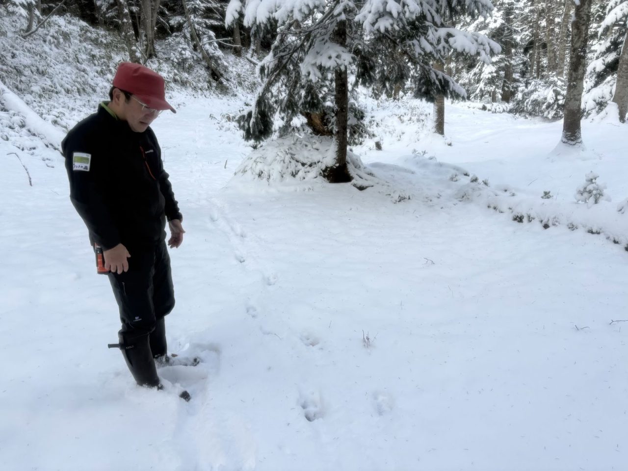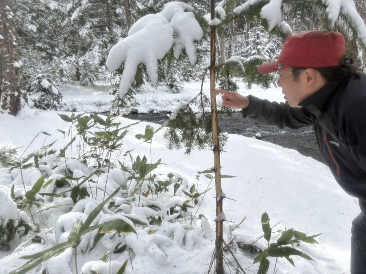 新雪に覆われたとはいえ、森の中には自然の動きや動物が残した痕跡が至るところに見られ、生命の息づかいを感じた。そうした現象の説明から自然と人間との調和、地球の取り扱いかたに至るまで上野さんの話は広がり、大自然の中で暮らす人間のあり方を考えさせられた。