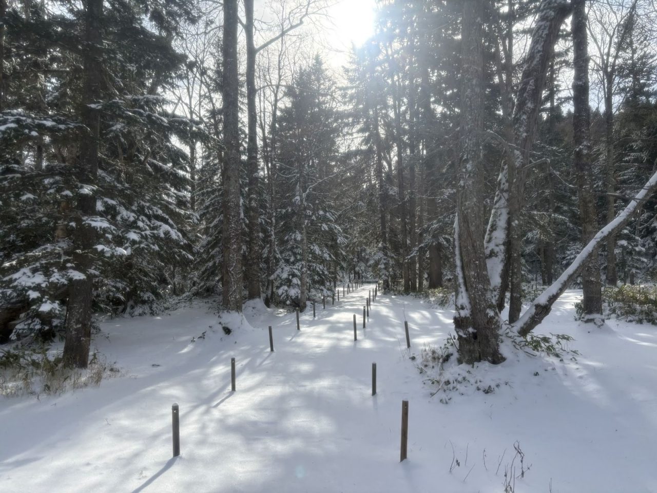 取材に先立ち、上野さんがガイドする森の散策ツアーに参加した。歩いたのは、阿寒湖と屈斜路湖の中間に位置する原生林「ノンノの森」の一角。ここは北海道で唯一の森林セラピー基地になっていて、森林セラピストによる森林セラピー(森林浴)や、さまざまな自然体験ができる。また、ノンノの森ネイチャーセンターの隣には温泉付きの「ランプの宿森つべつ」があり、滞在しながら森が楽しめる。取材当日は前日に雪が降ったため、ノンノの森の一角をスノーハイクする体験を味わえた。