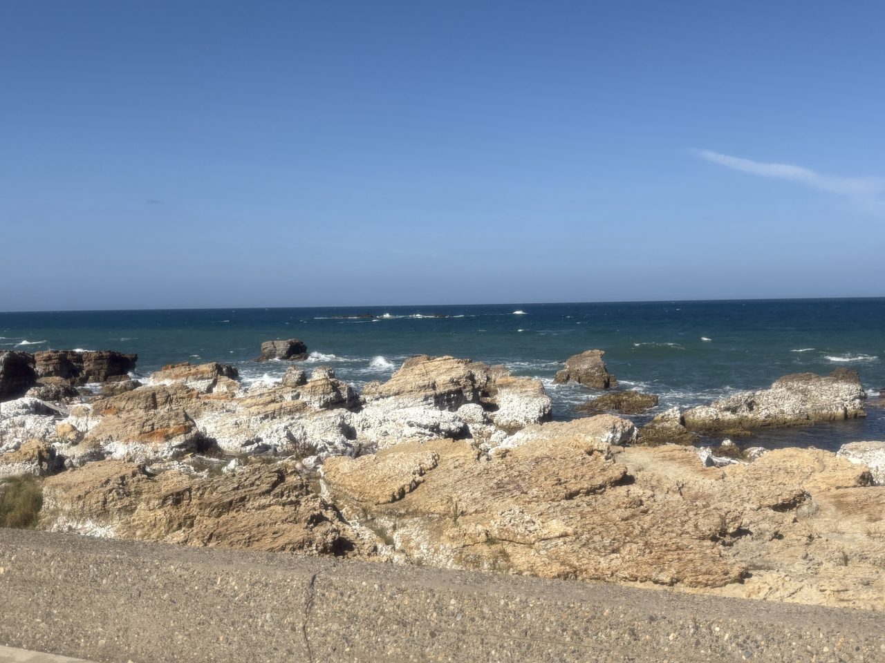 海岸線は大きく隆起し、海中から露出した岩が白く見えていました。