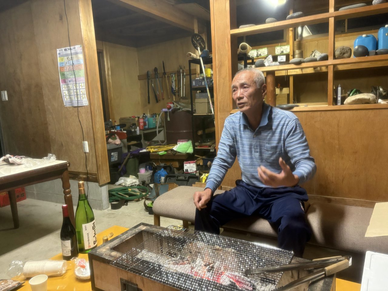 能登に到着した10月14日夜は、穴水町在住の会員、新田信明さんが経営する農家民宿「孫重郎」に宿泊しました。新田さんが住む岩車集落は、穴水の中心街から離れた海沿いにある静かな漁村。木造住宅が密集した風情ある集落。民宿前方には静かな穴水湾が広がる絶好の立地でした。