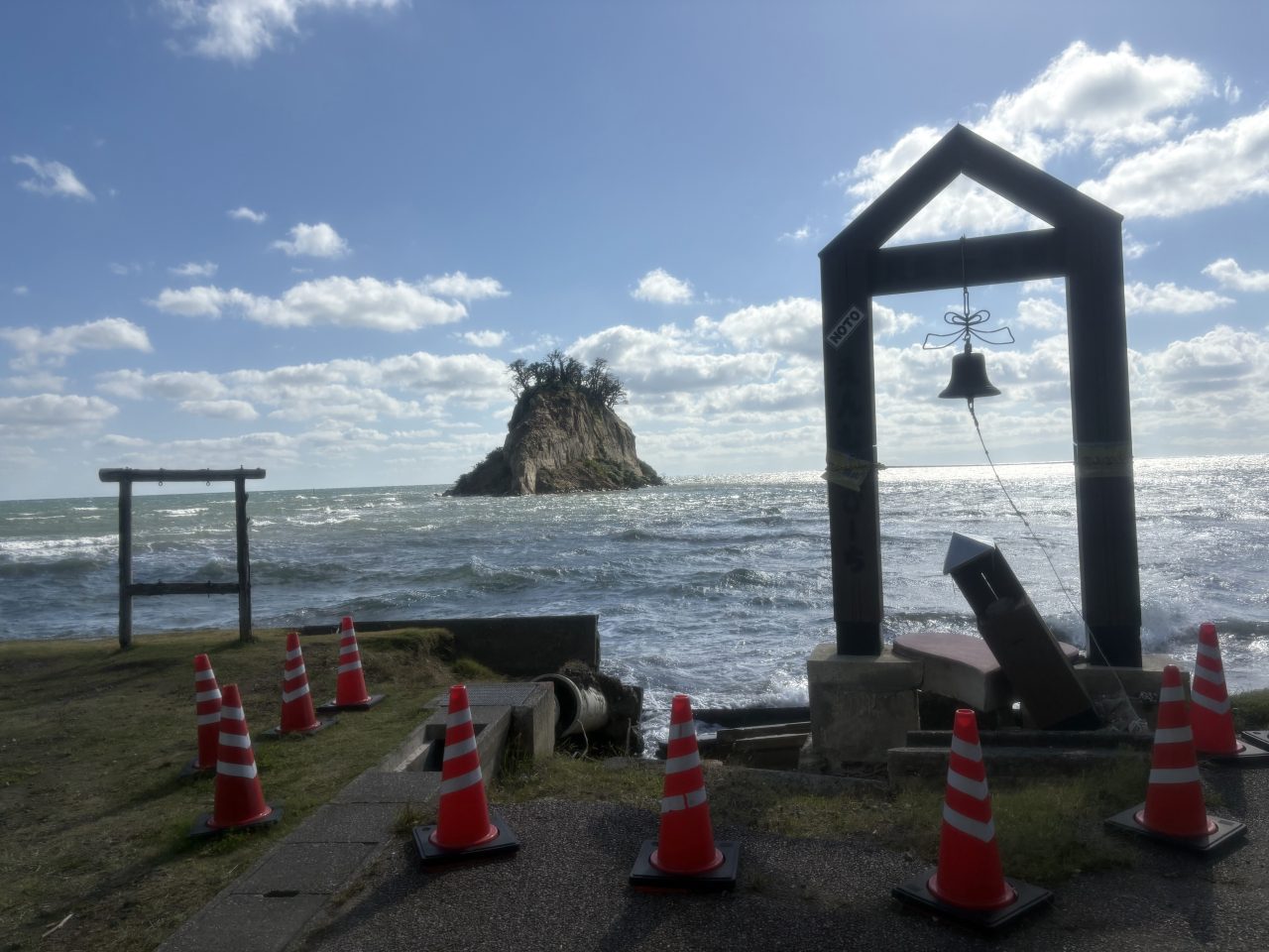 珠洲市の景勝地である見附島も、斜面が崩壊し、震災前の端正な姿が一変していました。縁結びの鐘も瓦礫と化していました。